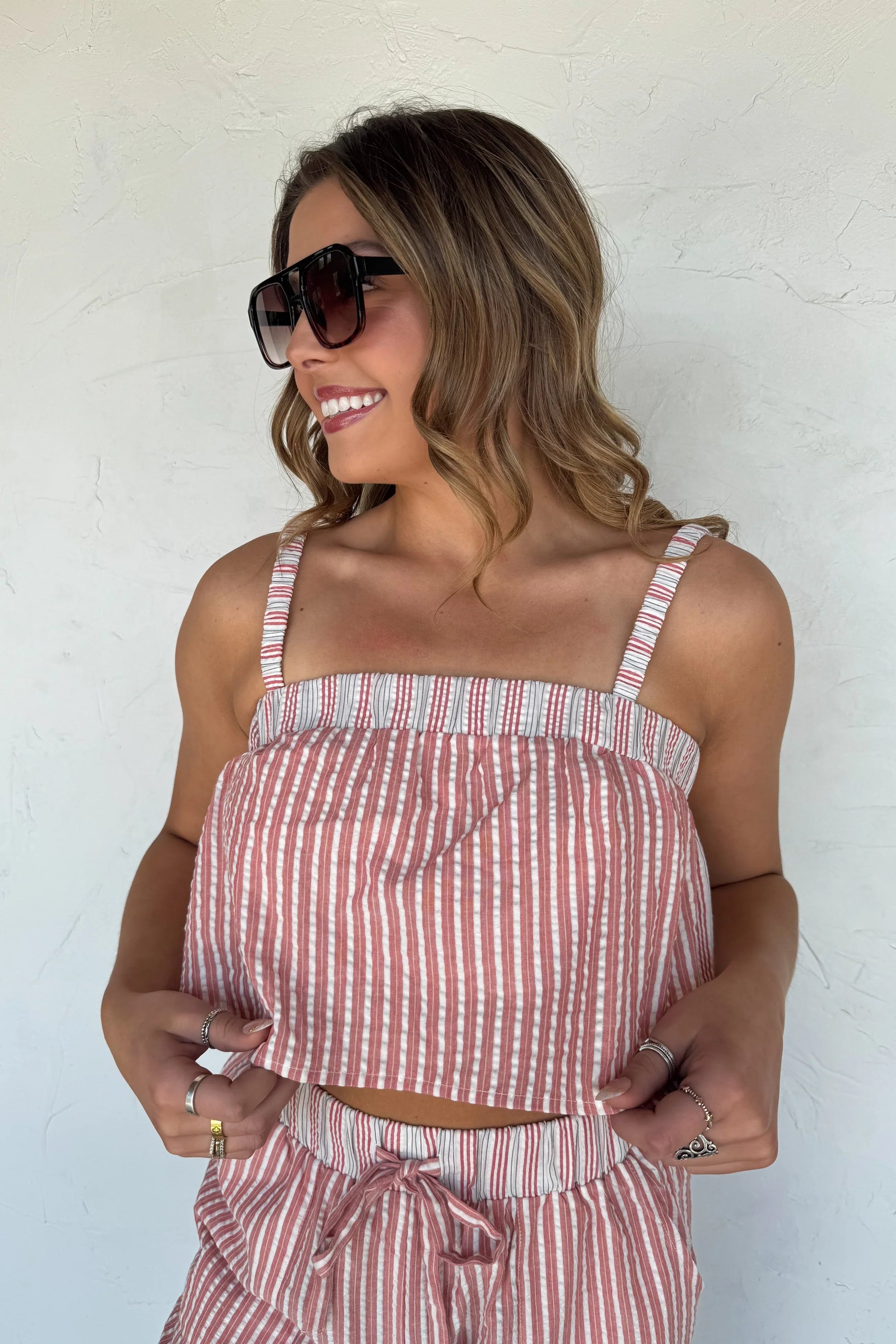 A breezy and relaxed seersucker tank and pant set featuring classic seersucker stripes. The flowy tank features elastic shoulder straps with a contrast matching fabric on the back.